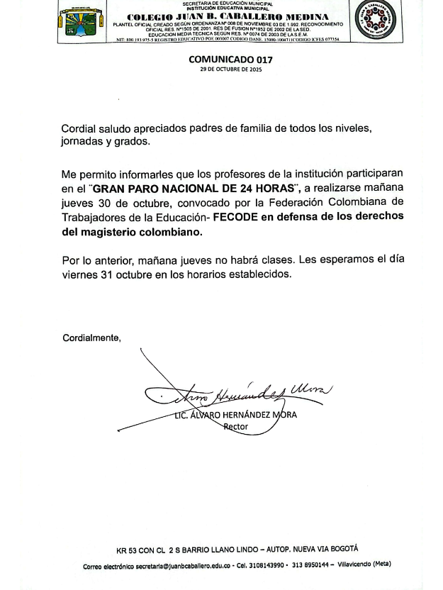 mañana, el día jueves 30 de Octubre se llevará acabo un paro nacional de 24 horas convocado por la Federación Colombiana de Trabajadores de la Educación (Fecode) por lo que mañana no habrá clases en la institución; el viernes 31 de Octubre se retomará nuestra jormada con normalidad
