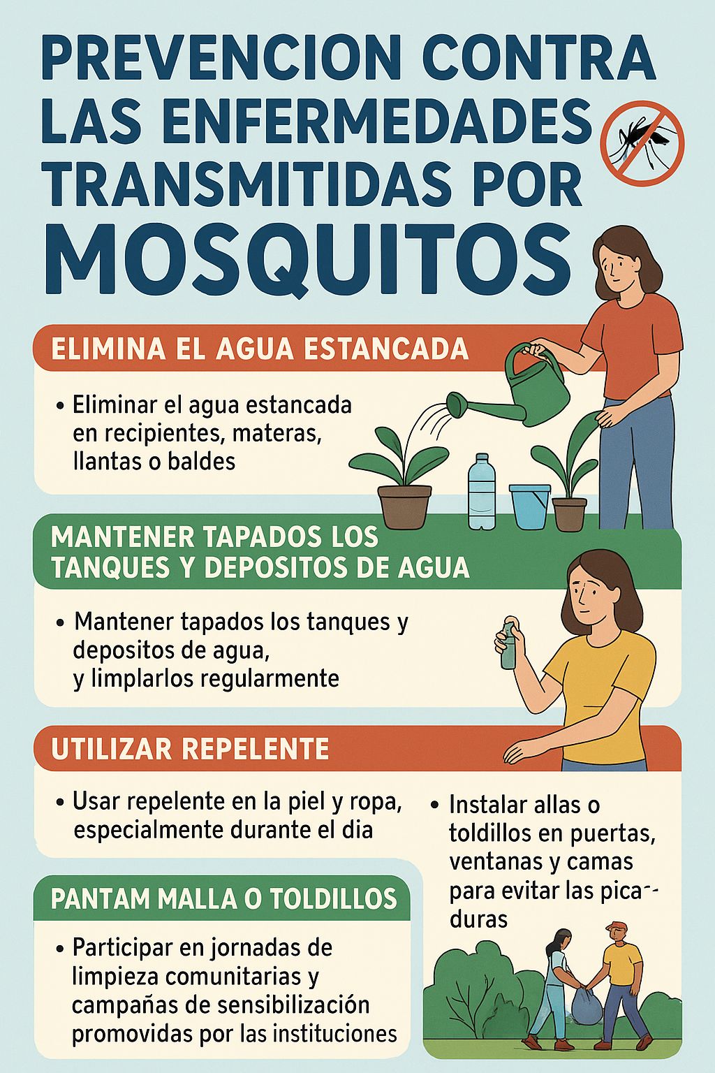 Las enfermedades transmitidas por mosquitos representan un grave problema de salud pública en muchas regiones del mundo, y Colombia no es la excepción. Infecciones como el dengue, el zika, el chikungunya y la malaria son causadas por la picadura de mosquitos infectados, especialmente del género Aedes aegypti, que se reproduce con facilidad en aguas estancadas y ambientes cálidos. La prevención es la mejor herramienta para combatir estas enfermedades. Cada persona puede contribuir desde su hogar y su comunidad a evitar la propagación de los mosquitos, adoptando hábitos sencillos pero efectivos, como:
